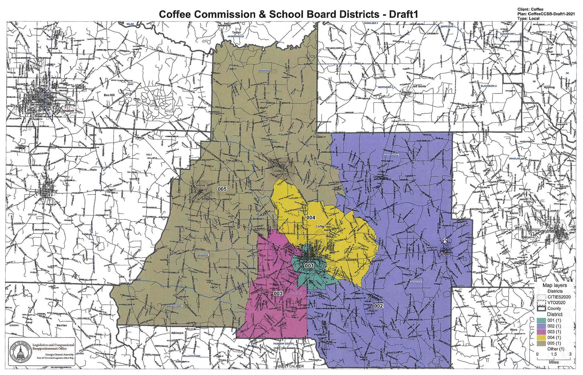 The PDF map linked below contains a visual map of Coffee County with color-coded district lines indicating School Board Districts based on location of residence. Please call the district office at 912-384-2086 if you need help finding your election district. For assistance with the website through email, send a message to accessibility@coffee.k12.ga.us. You may also visit https://www.coffee.k12.ga.us/accessibility and use the Accessibility Support Contact Form.